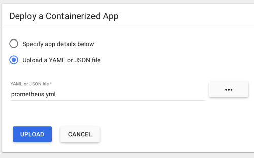To get started quickly, we have provided a sample YML file that can be used as a template. This file will create a prometheus Namespace, Service, Deployment, and ConfigMap in Kubernetes. You can upload this file to the Kubernetes dashboard using + Create at the top right.
